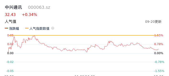 09月20日,中兴通讯收报32.43,股价涨幅0.34%,成交金额9.73亿元,换手率0.74%。