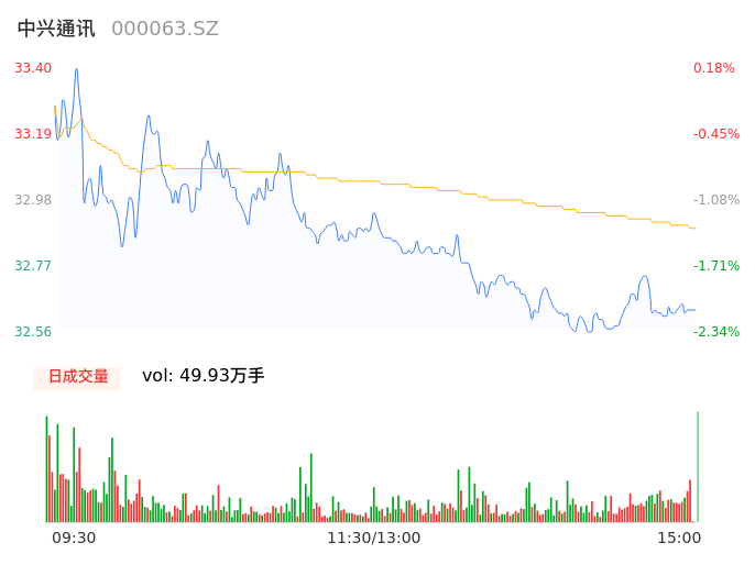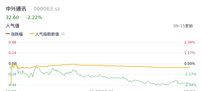 09月15日,中兴通讯收报32.60,股价涨幅-2.22%,成交金额16.42亿元,换手率1.24%。