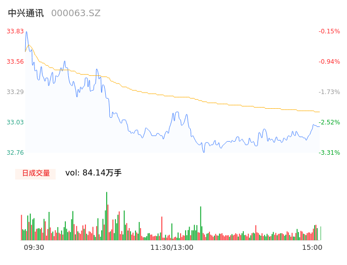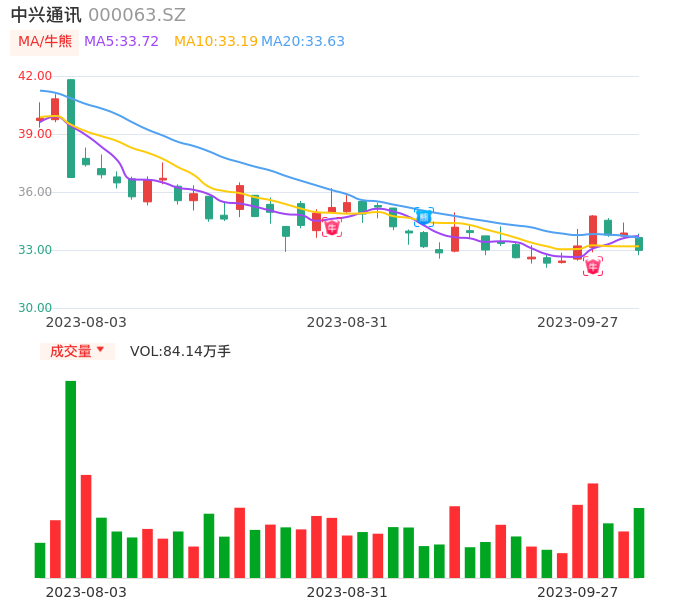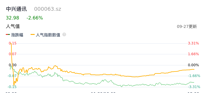 09月27日,中兴通讯收报32.98,股价涨幅-2.66%,成交金额27.87亿元,换手率2.09%。