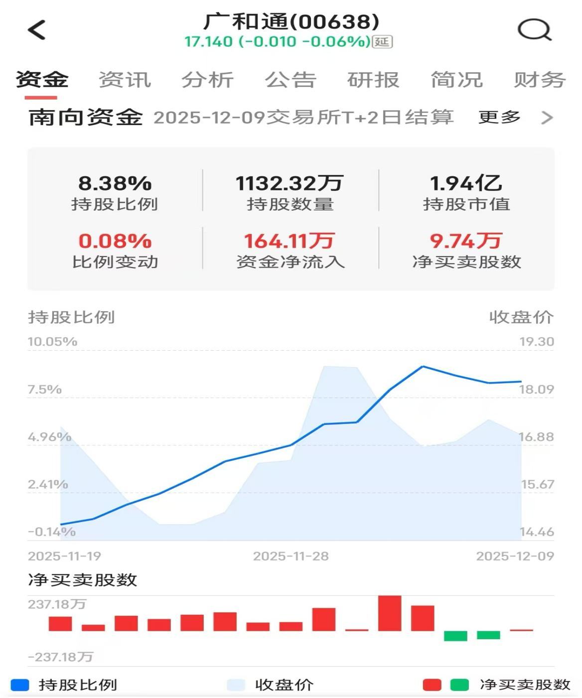 智通财经APP发现,自11月17日广和通被正式纳入港股通之后,南向资金便开始不断增持广和通H股。至12月4日时,南向资金持有广和通H股的数量已高达1244.72万股,持股比例一路飙升至9.2%。