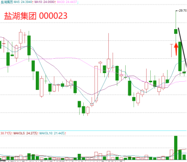 盐湖集团,箭头处是2009年7月28日的走势,当日换手31%,长上影线收盘;第二日大幅低开并迅速砸低,其后股价一路下行。
