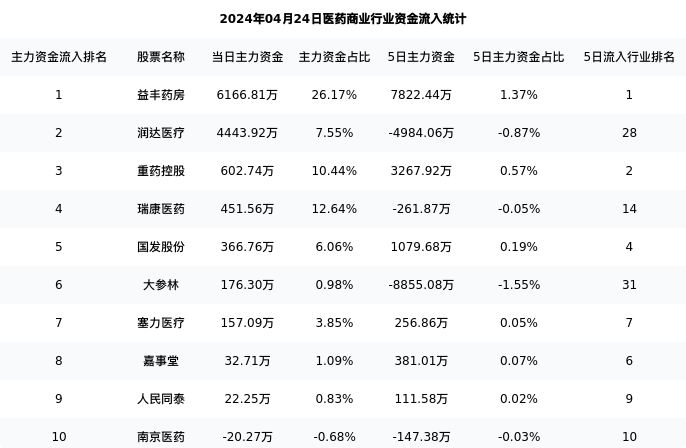 从主力资金流向来看,医药商业行业今日主力资金流入7.05亿元,在所有申万二级行业中排名:126/131。
