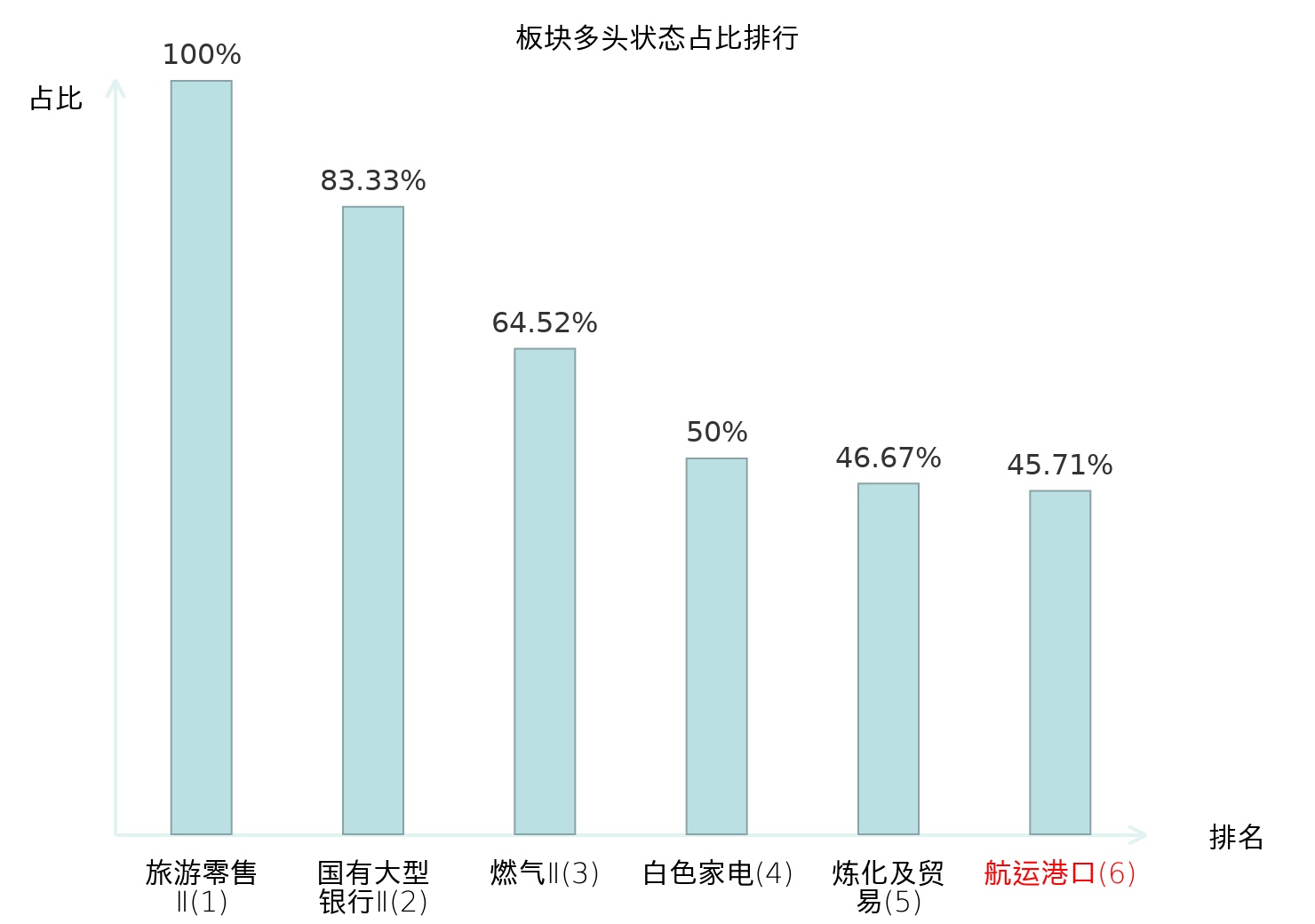 全市场所有行业板块中主力多头状态占比排名中,旅游零售Ⅱ板块位居第一。农产品加工板块名次提升最快,较昨日上升82位。