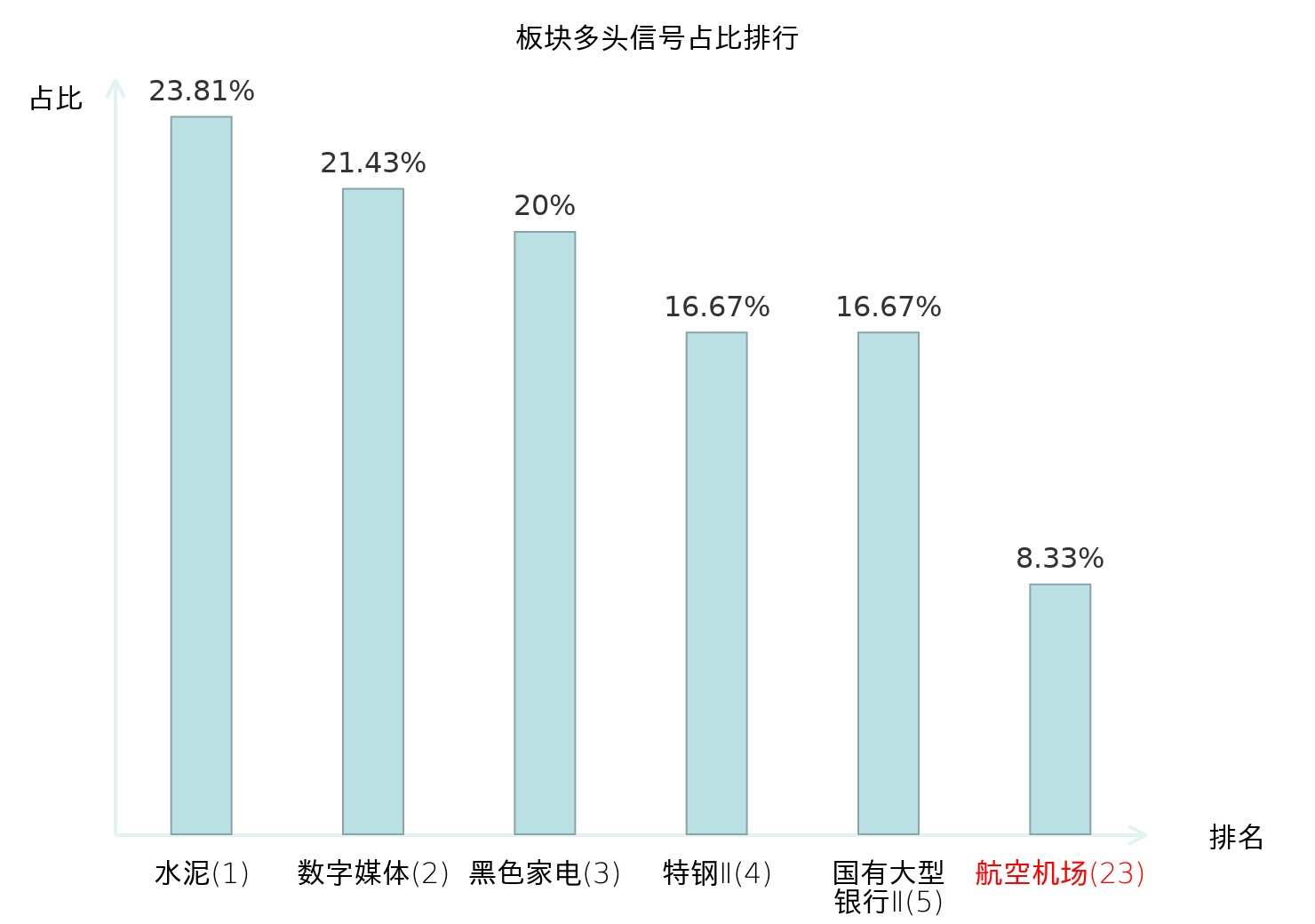 全市场所有行业板块中主力多头信号占比排名中,水泥板块位居第一。焦炭Ⅱ板块名次提升最快,较昨日上升115位。