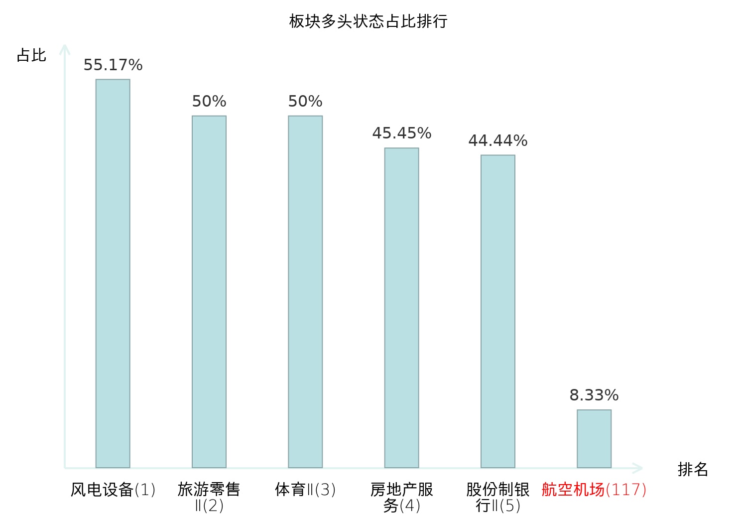 全市场所有行业板块中主力多头状态占比排名中,风电设备板块位居第一。保险Ⅱ板块名次提升最快,较昨日上升64位。