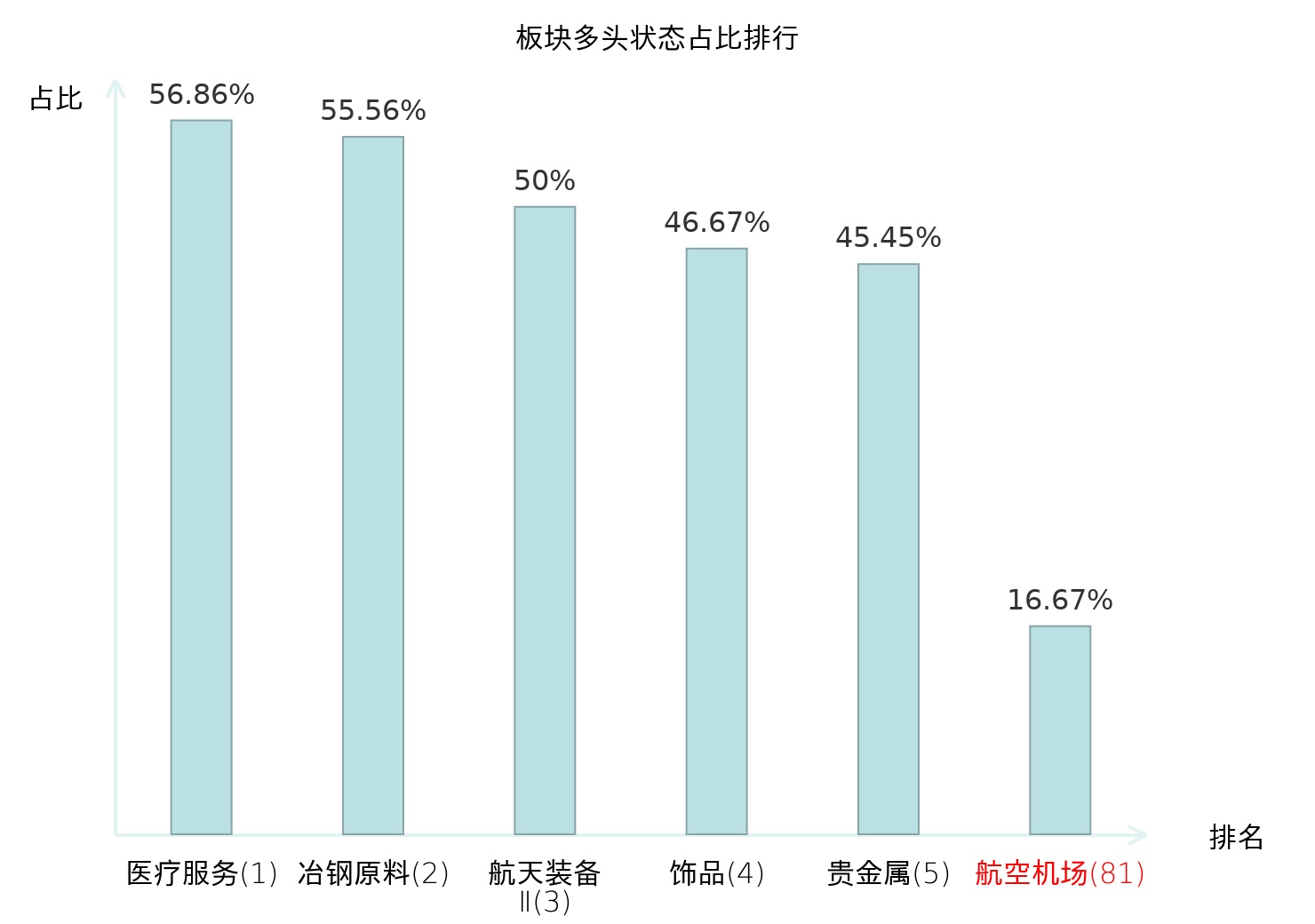 全市场所有行业板块中主力多头状态占比排名中,医疗服务板块位居第一。旅游及景区板块名次提升最快,较昨日上升61位。