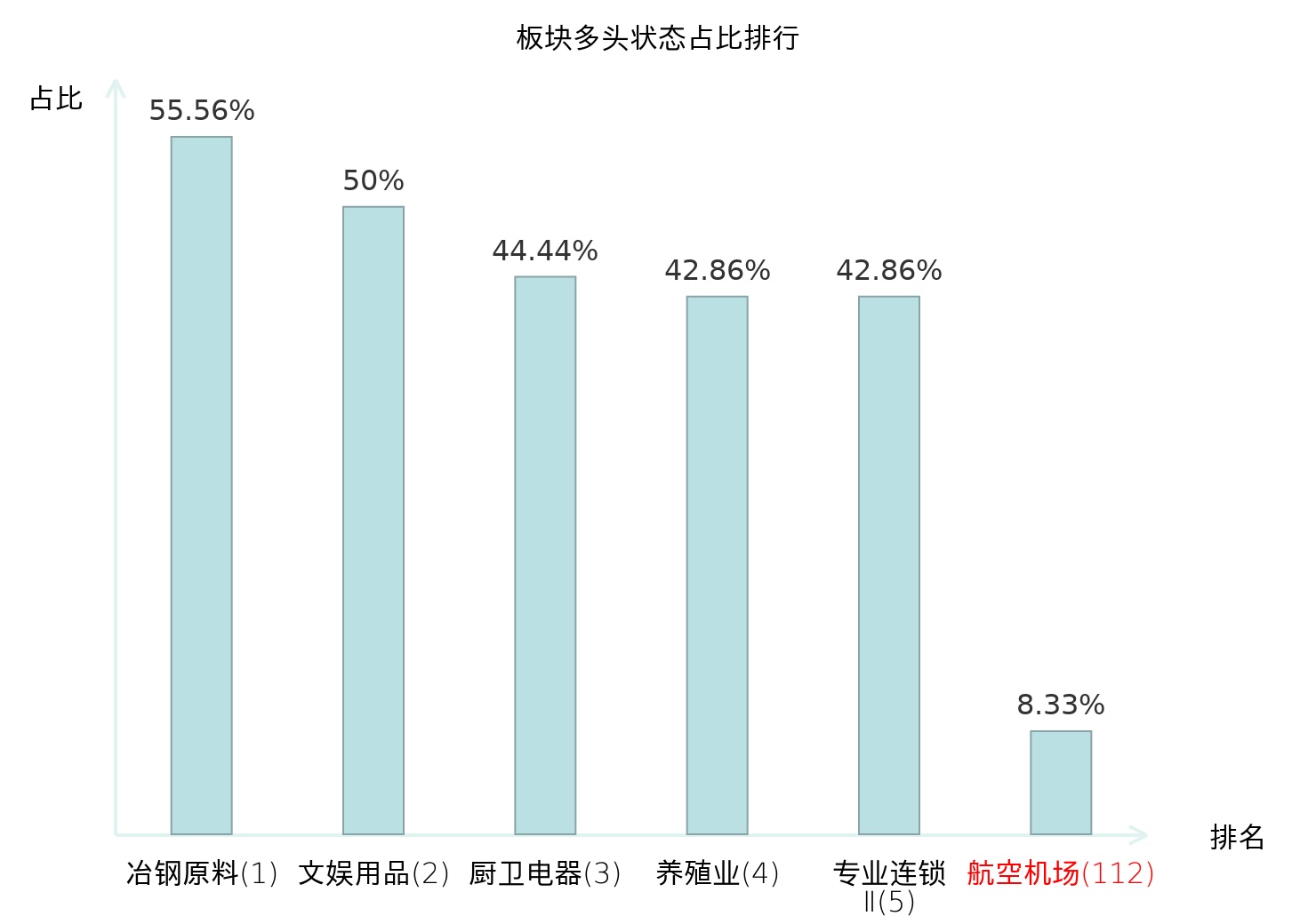 全市场所有行业板块中主力多头状态占比排名中,冶钢原料板块位居第一。能源金属板块名次提升最快,较昨日上升48位。