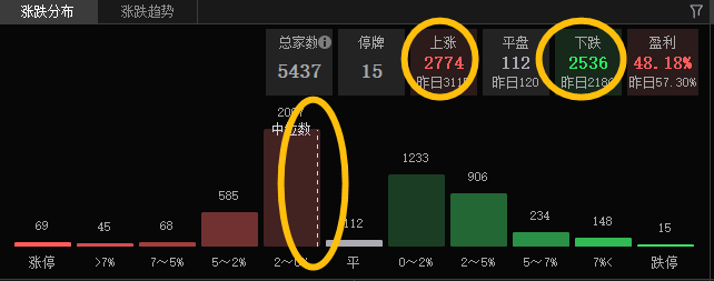 指数虽然跌不少,但是个股情绪还算温和,涨跌参半,涨停近70只,跌停15只,中位数微红。黄白线分化割裂明显,白线跌幅巨大,典型的权重成分股调整的一天。量能表现上,昨天大幅放量近5000亿,今天缩量近1400亿,没有延续放量,全天成交量在2.5万亿上方,情绪上并没有因为指数的大跌而特别的悲观。