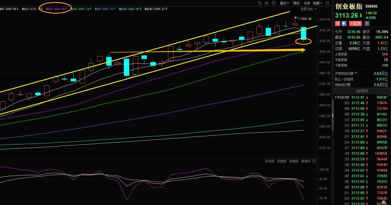 而创业板在20日线这里如果市场情绪回暖够强,那么会同9月初那样反弹修复,若是弱一些回撤到30日线3000点上方一带再企稳也可能。这个阶段主要还是要回避前期波段涨幅比较大的科技、新能源等一些大市值权重股,积累了大量的散户、融资获利盘,需要砸盘清洗一下筹码结构。