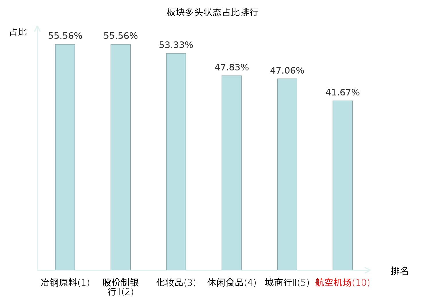 全市场所有行业板块中主力多头状态占比排名中,冶钢原料板块位居第一。其他家电Ⅱ板块名次提升最快,较昨日上升105位。
