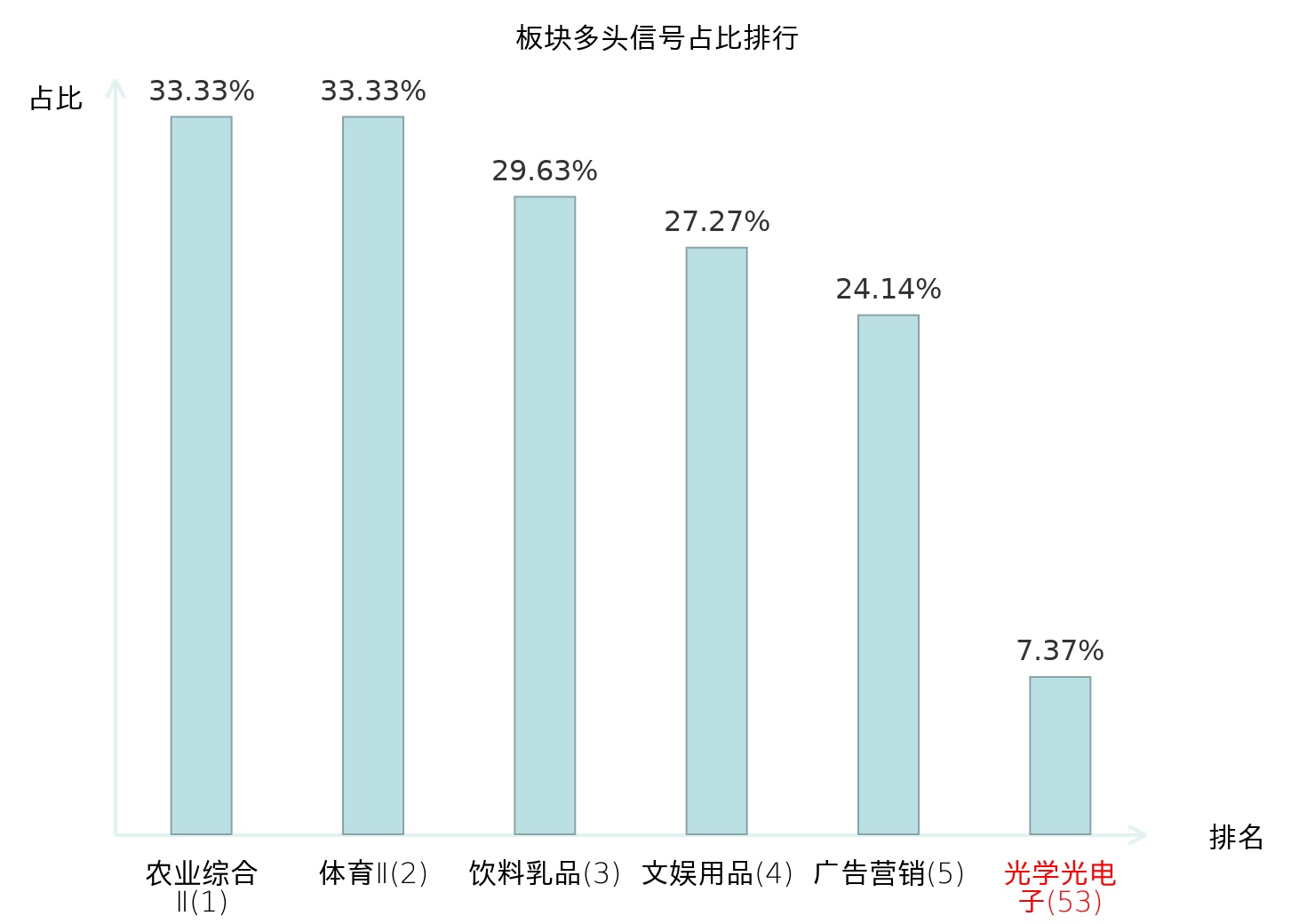 全市场所有行业板块中主力多头信号占比排名中,农业综合Ⅱ板块位居第一。体育Ⅱ板块名次提升最快,较昨日上升128位。
