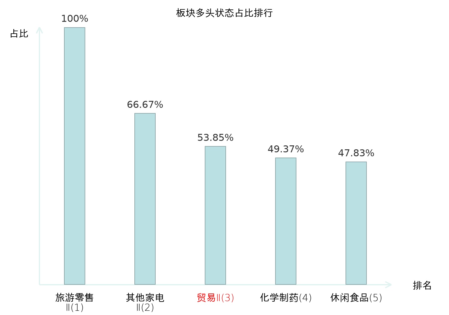 全市场所有行业板块中主力多头状态占比排名中,旅游零售Ⅱ板块位居第一。互联网电商板块名次提升最快,较昨日上升55位。