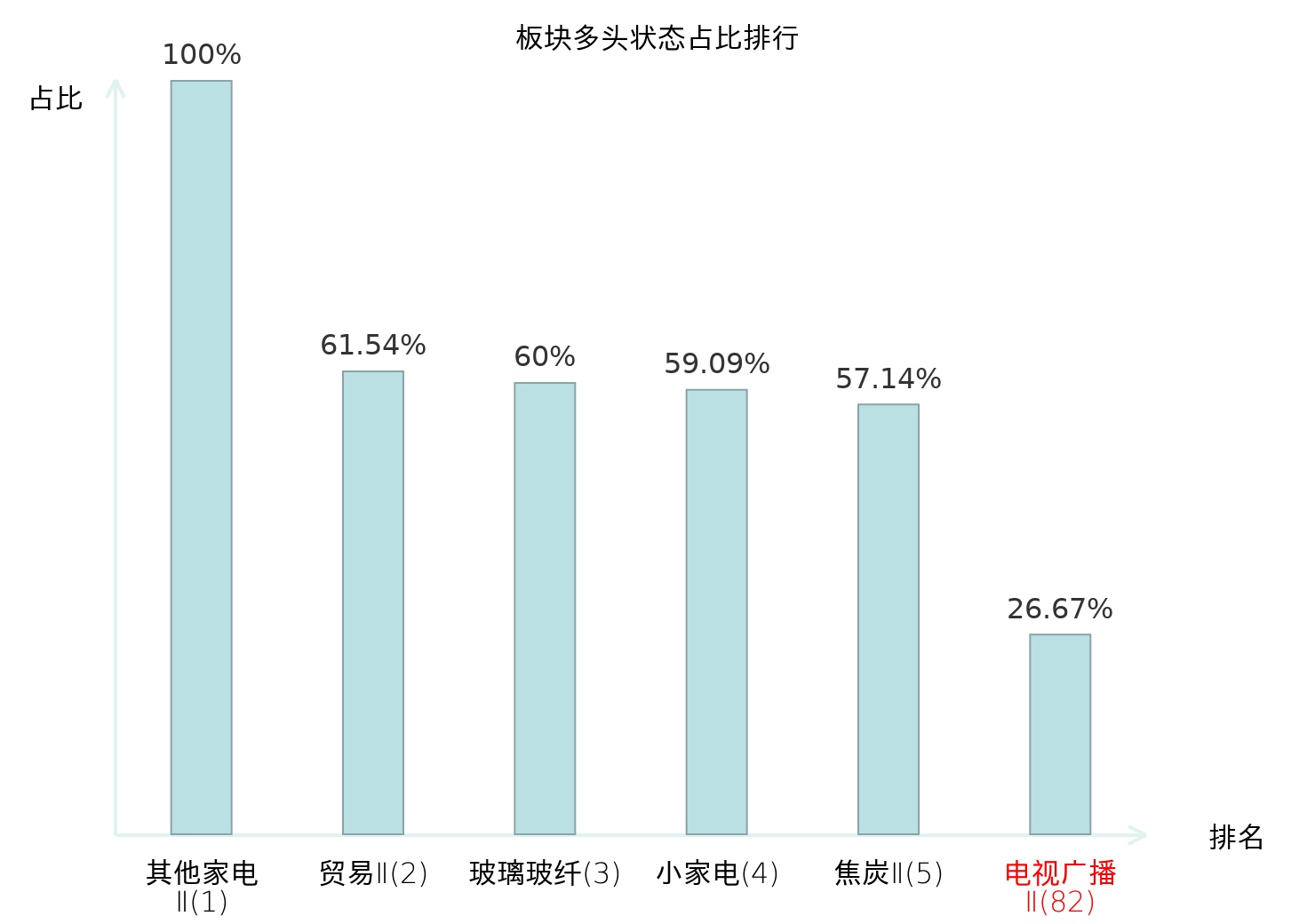 全市场所有行业板块中主力多头状态占比排名中,其他家电Ⅱ板块位居第一。摩托车及其他板块名次提升最快,较昨日上升76位。