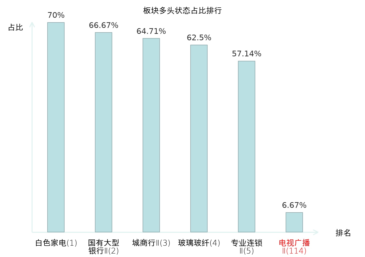 全市场所有行业板块中主力多头状态占比排名中,白色家电板块位居第一。油气开采Ⅱ板块名次提升最快,较昨日上升96位。
