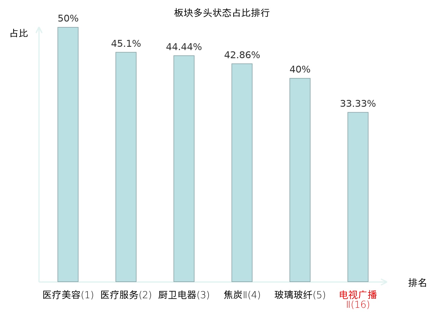 全市场所有行业板块中主力多头状态占比排名中,医疗美容板块位居第一。养殖业板块名次提升最快,较昨日上升90位。