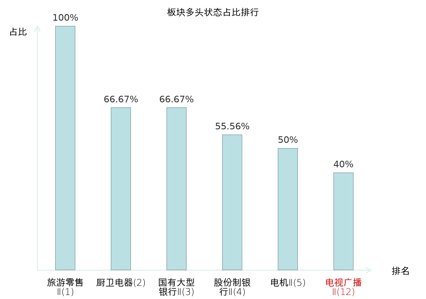 全市场所有行业板块中主力多头状态占比排名中,旅游零售Ⅱ板块位居第一。水泥板块名次提升最快,较昨日上升80位。