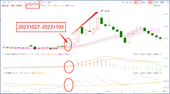 我们首先观察,周MACD是否在零轴附近金叉,零下金叉也不能距离零轴太远,并且股价运行到周ENE轨道线最上面一条,在上穿上轨道的那周如果周OBV是上穿均线(或者OBV指标刚刚在MAOBV均线附近拐头向上)的说明动力充足,本周就可以考虑分仓买入。