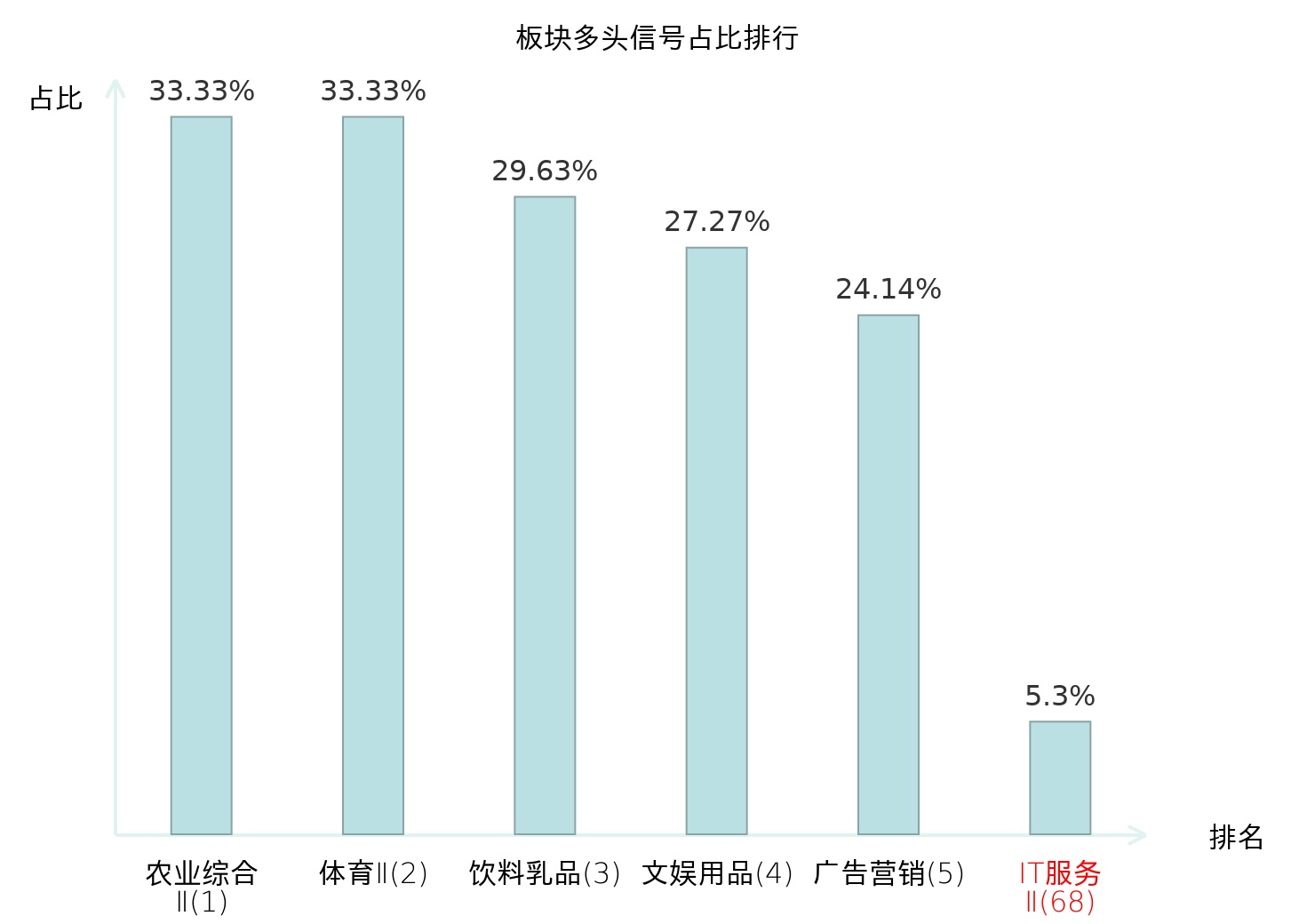 全市场所有行业板块中主力多头信号占比排名中,农业综合Ⅱ板块位居第一。体育Ⅱ板块名次提升最快,较昨日上升128位。