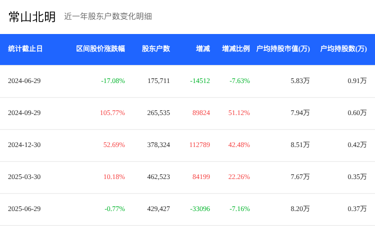 根据常山北明(000158)2025年半年报数据显示,截至2025年6月30日,公司股东户数为42.94万户,较上一报告期减少了7.16%,户均持股数量环比增加了7.71%,户均持股市值为8.20万元,环比增加了6.88%。这表明股东结构出现了集中化趋势,单个股东的持股数量和市值有所提升。
