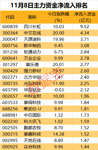 行业方面,有6个行业主力资金净流入,传媒行业净流入18.35亿元,家用电器行业净流入超4.36亿元。非银金融净流出金额居首,为33.22亿元;汽车、通信、电子等三个行业净流出资金均超20亿元。
