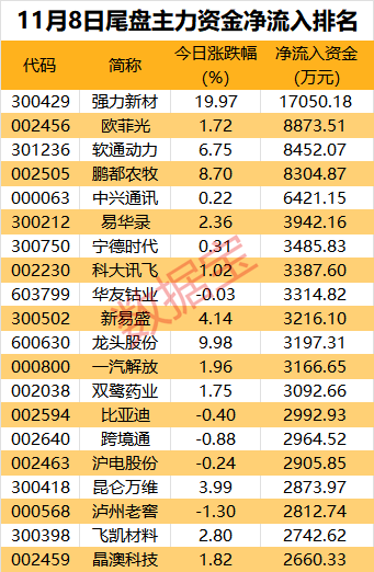 个股方面,有5股尾盘净流入资金超5000万元。强力新材尾盘涨停,主力资金净流入1.7亿元。公司为光刻胶龙头,此前在投资者互动平台表示,目前公司的光敏性聚酰亚胺处于下游客户验证阶段。