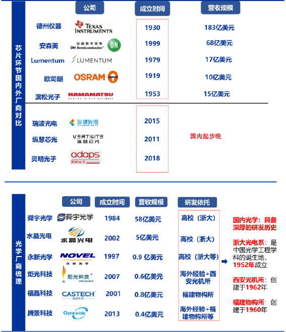 结合第三方数据分析,我们认为在激光雷达中光学组件平均占比有望超过20%。解析激光器及各类芯片环节,虽已有国内厂商出现,但整体市场还是掌握在国外厂商手中;而光学组件,由于基础深厚,成本管控能力强,有望成为整个产业链当中首先突破环节。