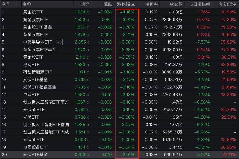 黄金主题ETF跌幅居前,永赢黄金股ETF跌幅达4.16%,领跌全市场千余只ETF,国泰、工银瑞信、华安等6只黄金主题ETF跌幅超过3%。此外,中韩半导体ETF、科创新能源ETF、光伏ETF、人工智能等ETF等板块行业同样跌幅超3%。