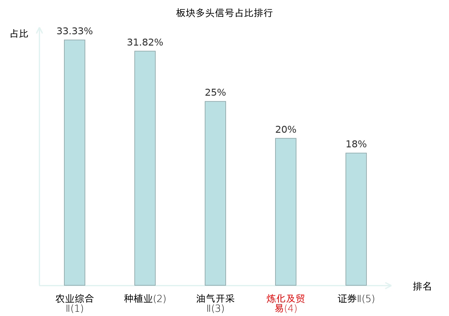 全市场所有行业板块中主力多头信号占比排名中,农业综合Ⅱ板块位居第一。农业综合Ⅱ板块名次提升最快,较昨日上升127位。