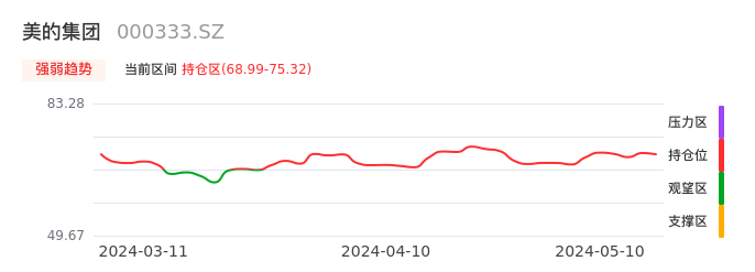 我们来看一下该股的九方特色指标强弱趋势的情况:美的集团自03月27日从观望区上穿到持仓区。股价近期在多头区域持续强势上扬,上升动能仍较为充足,可积极关注。后续重点关注上方压力位:75.32元是否能突破上攻。