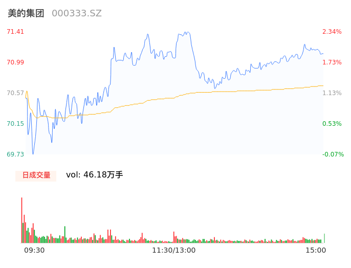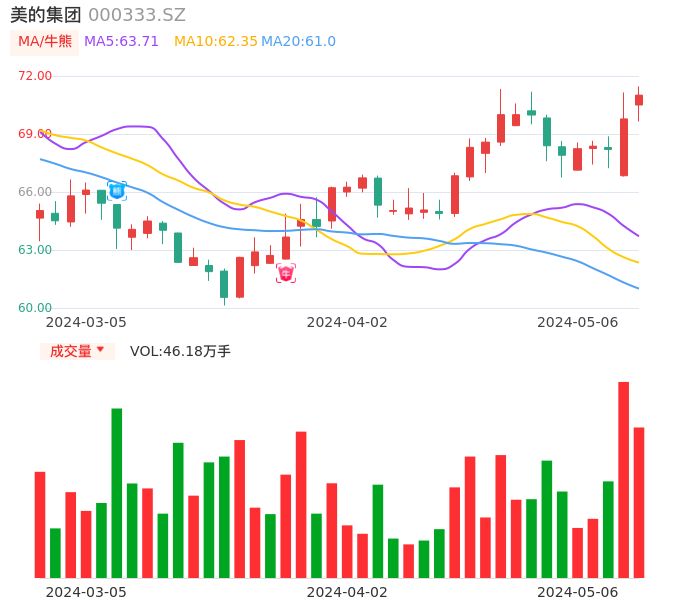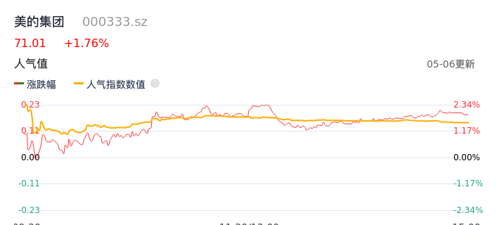 05月06日,美的集团收报71.01,股价涨幅1.76%,成交金额32.64亿元,换手率0.68%。