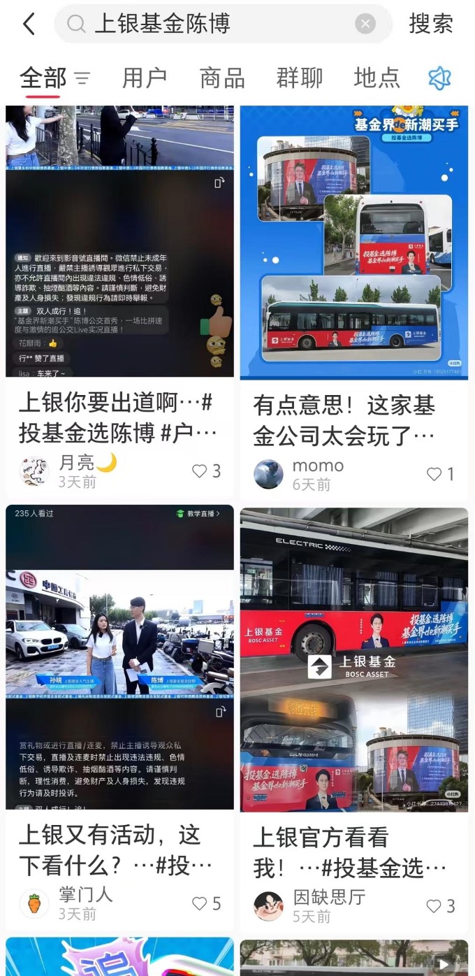 当财联社记者打开小红书搜索“上银基金”或者“陈博”,映入眼帘的并不是研究笔记或投资分析,而是一张张与公交广告或商场屏幕合影的自拍图,搭配热烈讨论的是“这杯子怎么抽的?”“帅哥什么时候直播?”甚至“感觉这是恋综拍摄现场”。作为活动的组织者,上银基金显然高估了用户对投资产品的关注度。