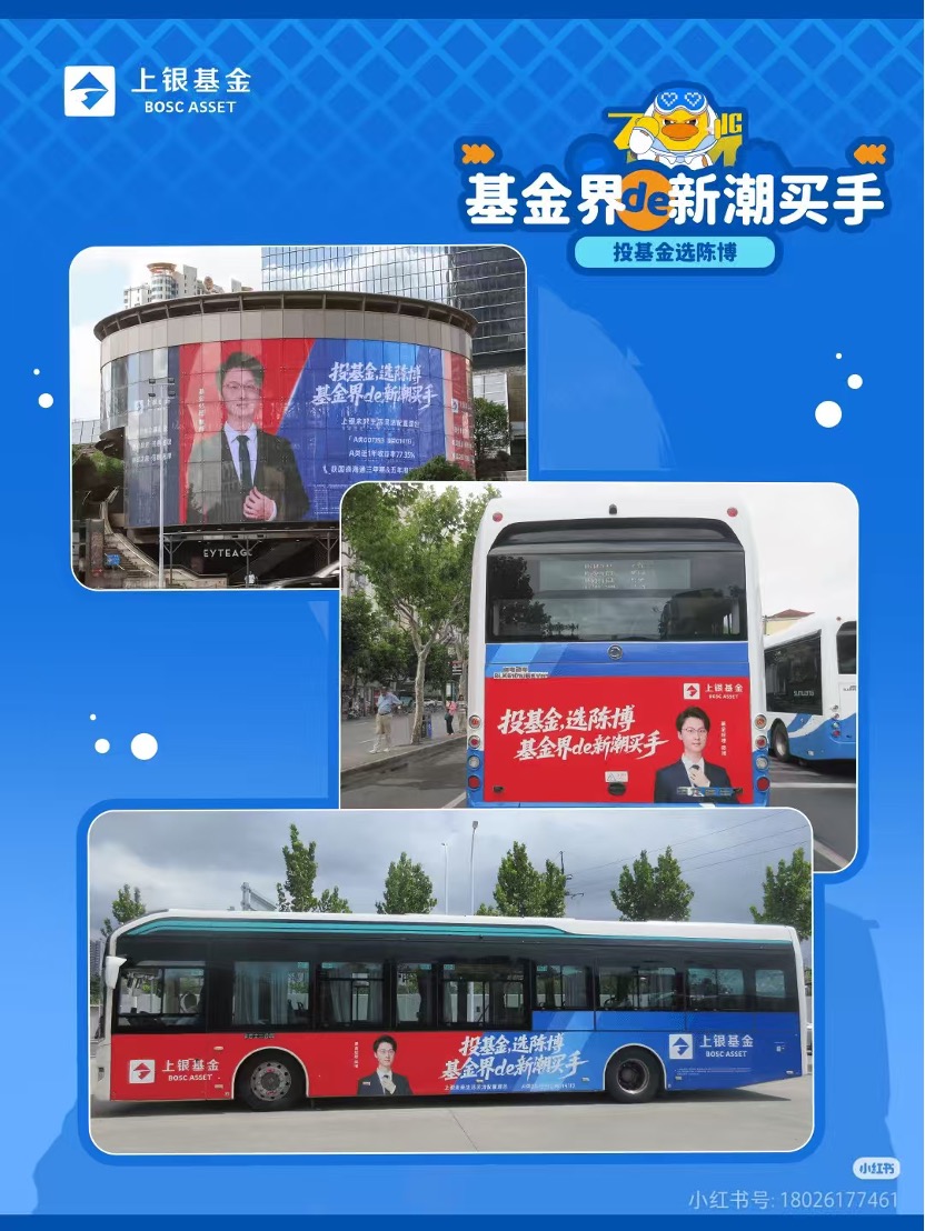 “投基金,选陈博”,一位基金经理的正装照巨幅广告出现在公交车身与商场大屏,看起来像是在宣传恋爱综艺而非金融产品,也像是哪家的偶像男团出道。但这广告背后,其实是金融机构上银基金。