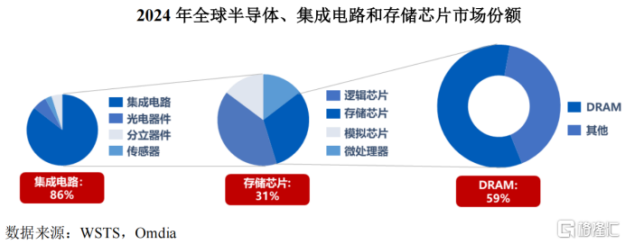 根据Omdia和WSTS数据,DRAM是当前市场规模最大的存储芯片,2024年全球DRAM市场规模为976亿美元,占存储芯片市场规模的比例约为59%。
