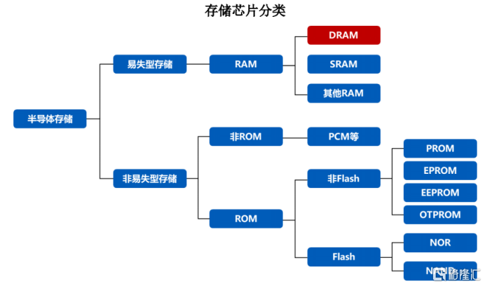 根据断电后数据是否丢失,存储芯片分为易失型存储和非易失型存储两类。易失型存储主要指随机存取存储器(RAM),需要维持通电以临时保存数据供主系统CPU读写和处理,而非易失型存储主要包括只读存储器(ROM),无需持续通电亦能长久保存数据的存储器。