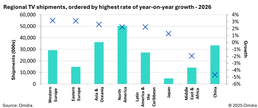预计2026年增长最快的市场将出现在欧洲,其中西欧电视出货量预计增长3.2%,东欧出货量预计增长3.1%。作为赛事举办地的北美市场也有望实现稳健增长,增幅约为2.2%。