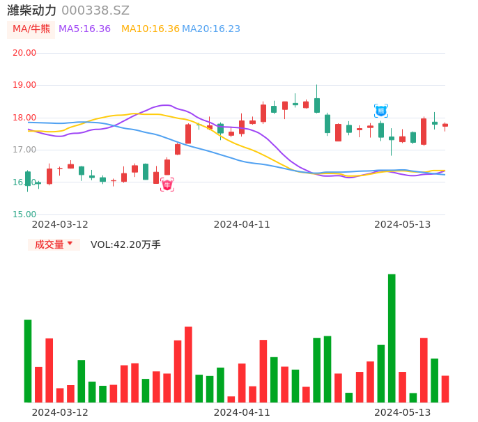 05月13日,潍柴动力收报17.80,股价涨幅0.06%,成交金额7.49亿元,换手率0.85%。