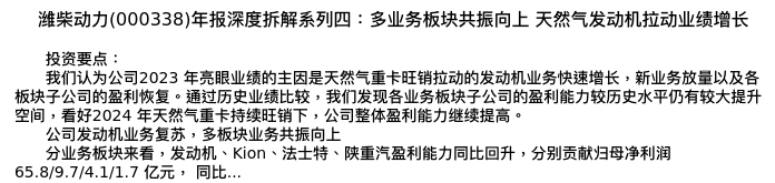值得注意的是:2024年05月国联证券的高登/陈斯竹分析师,首次发布关于潍柴动力的研究报告,标题为:潍柴动力(000338)年报深度拆解系列四:多业务板块共振向上 天然气发动机拉动业绩增长。
