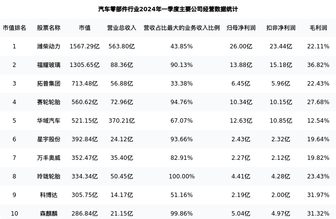 潍柴动力最新报告期数据为一季度,下表汇总了汽车零部件行业内市值靠前的公司一季度主要经营数据