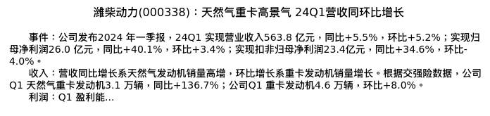 值得注意的是:2024年05月中泰证券的何俊艺分析师,首次发布关于潍柴动力的研究报告,标题为:潍柴动力(000338):天然气重卡高景气 24Q1营收同环比增长。