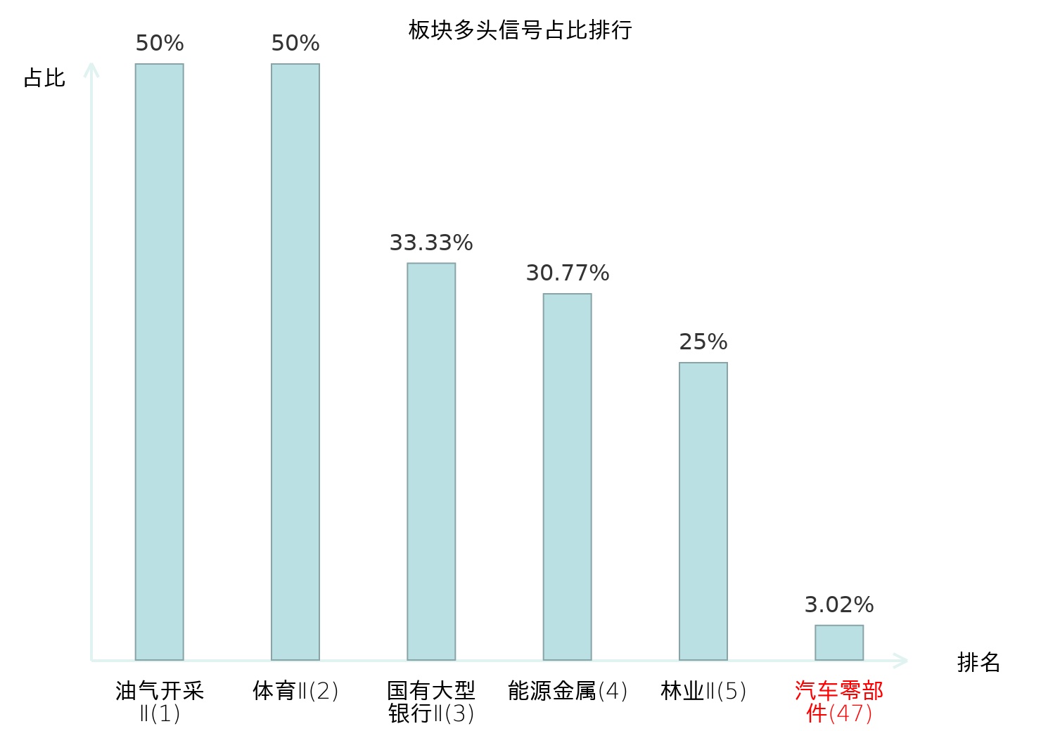 全市场所有行业板块中主力多头信号占比排名中,油气开采Ⅱ板块位居第一。体育Ⅱ板块名次提升最快,较昨日上升129位。