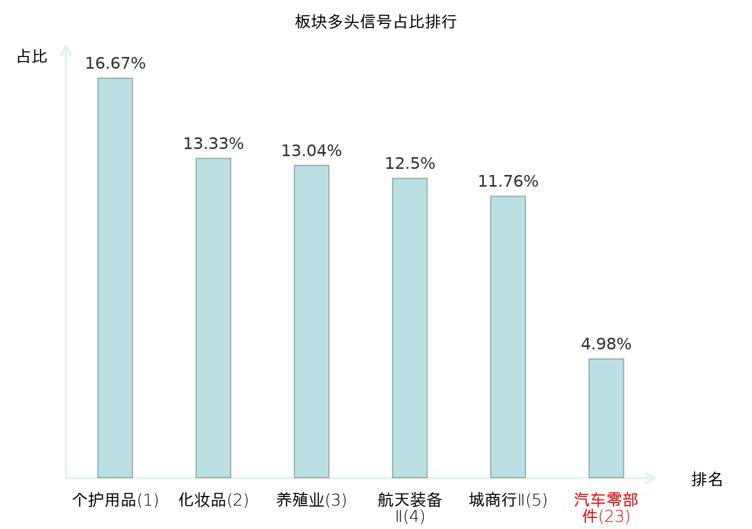全市场所有行业板块中主力多头信号占比排名中,个护用品板块位居第一。航天装备Ⅱ板块名次提升最快,较昨日上升118位。