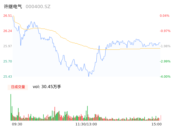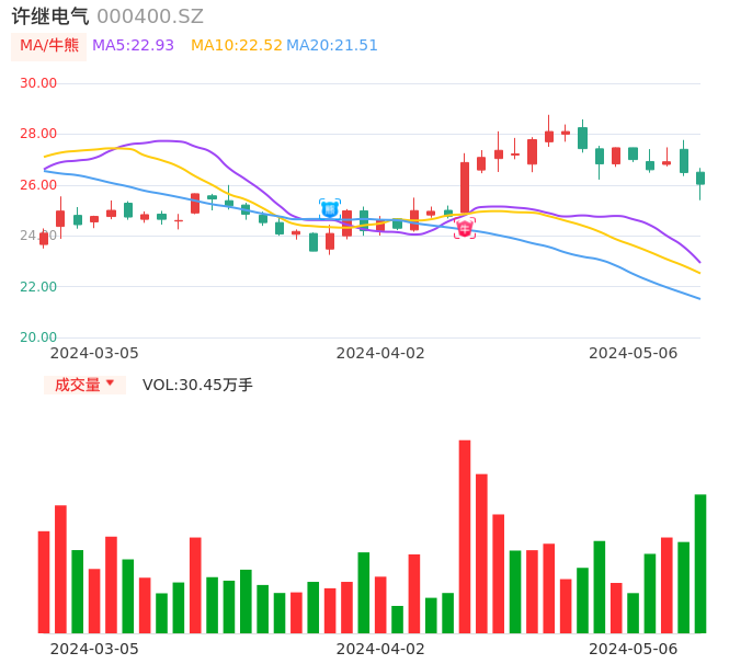 05月06日,许继电气收报26.03,股价涨幅-1.74%,成交金额7.90亿元,换手率3.02%。