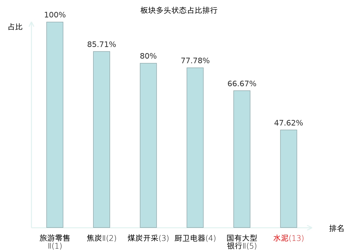 全市场所有行业板块中主力多头状态占比排名中,旅游零售Ⅱ板块位居第一。渔业板块名次提升最快,较昨日上升66位。
