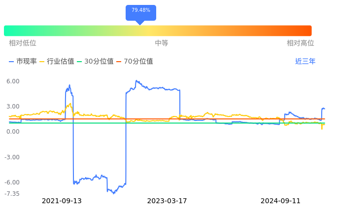 金融街当前市现率为2.70,在所属的房地产开发中,市现率排13,前5名分别为、华发股份市现率0.80、城投控股市现率0.93、中洲控股市现率0.97、城建发展市现率0.99、中交地产市现率1.11。金融街当前市现率为2.70,超过近3年79.48%的历史数据。