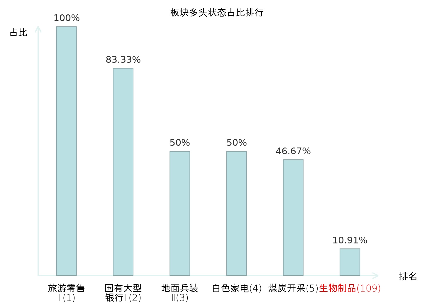 全市场所有行业板块中主力多头状态占比排名中,旅游零售Ⅱ板块位居第一。油服工程板块名次提升最快,较昨日上升107位。