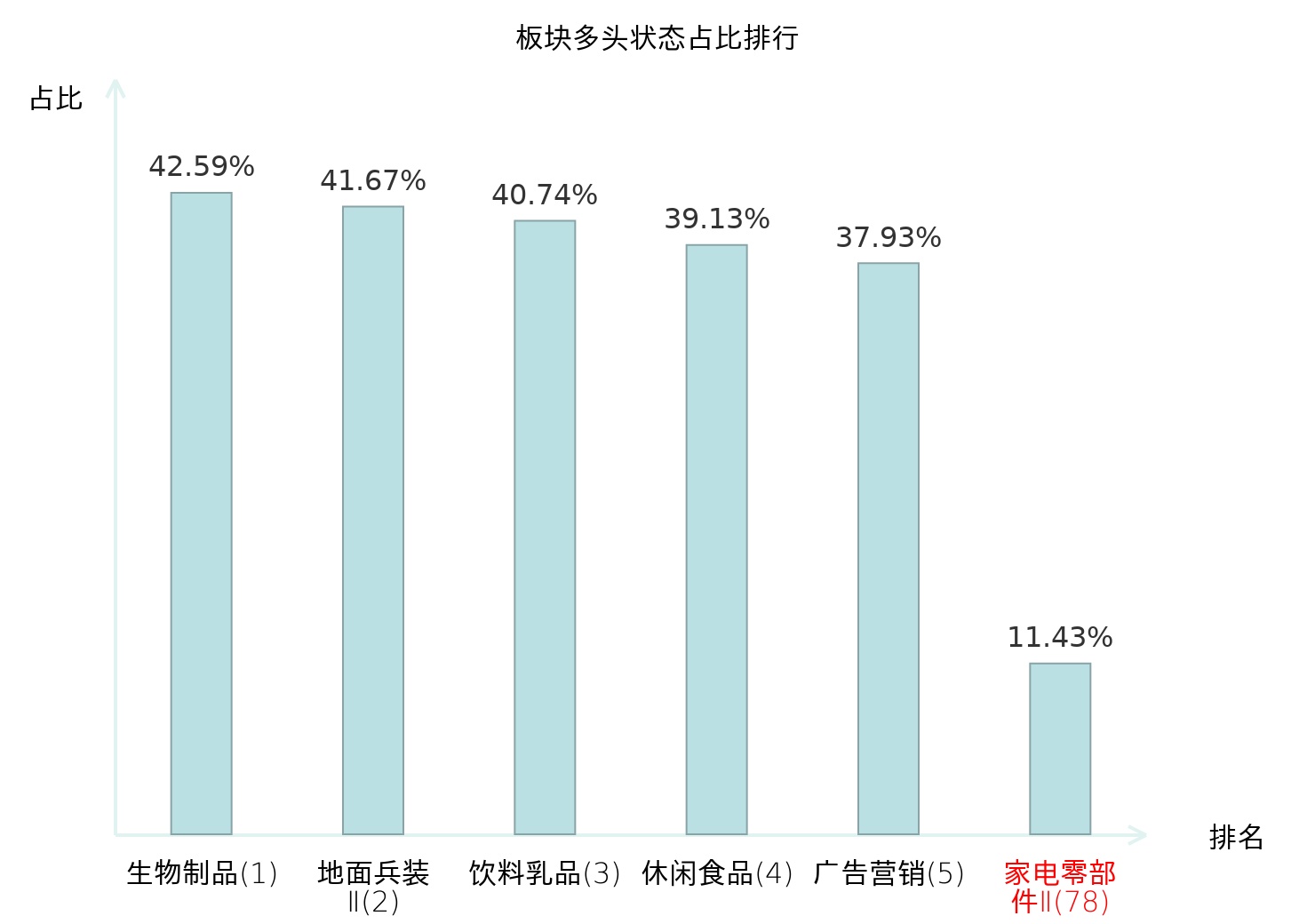 全市场所有行业板块中主力多头状态占比排名中,生物制品板块位居第一。黑色家电板块名次提升最快,较昨日上升65位。
