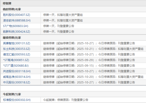 上证报中国证券网讯 10月28日,4家公司临停:胜利股份凌志软件ST广物航新科技,1家公司复牌:标准股份
