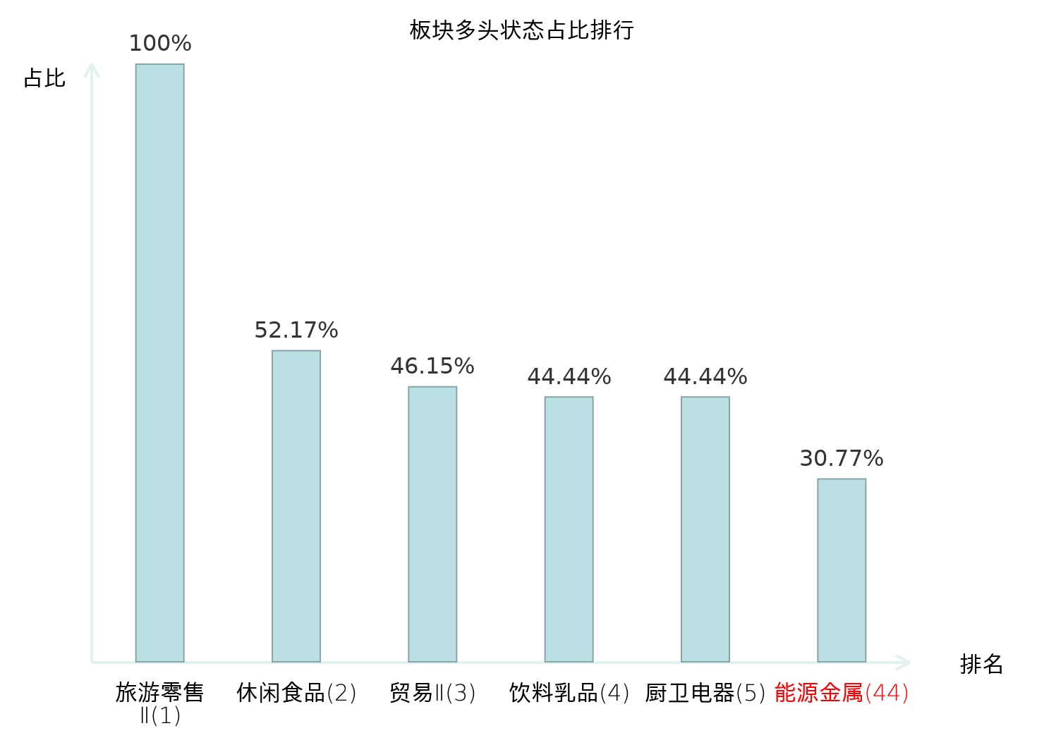 全市场所有行业板块中主力多头状态占比排名中,旅游零售Ⅱ板块位居第一。乘用车板块名次提升最快,较昨日上升91位。