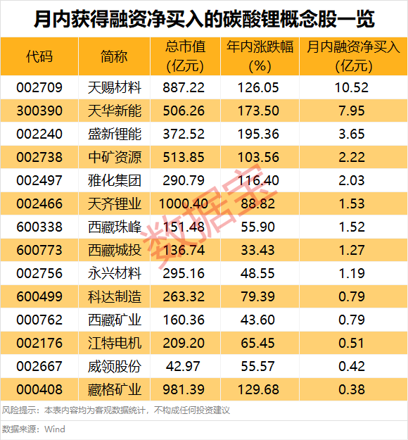 11月以来(截至11月19日),资金对碳酸锂相关概念股进行加持,七成概念股获得融资净买入,其中9股的融资净买入额超亿元。天赐材料11月以来共吸引10.52亿元融资净买入,产能方面,天赐材料正在着力进行海外扩张。当前,公司摩洛哥项目已完成土地勘察整理,计划于2025年底至2026年一季度开工建设;美国项目已完成工厂设计及相关前期手续办理,计划今年四季度开始土建施工,现有海外建设项目均计划于2027年底至2028年上半年完成建设。天华新能、盛新锂能、中矿资源、雅化集团等股的融资净买入额居前。