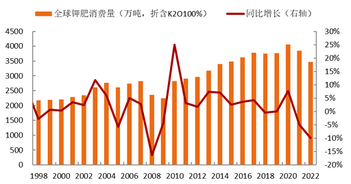 钾元素是植物生长所必须的三大营养元素之一。适当施用以钾为主要养分的肥料,可以改善土壤质量、有效促进植物酶的活化、增强植物光合作用、提高植物对氮元素的吸收利用,进而促进蛋白质合成,提高植物抗逆性、提高农产品的产量和品质。钾元素化学性质极为活泼,自然界中钾元素主要以盐的形式分布于陆地或海洋中,全球约95%的钾盐产品用做肥料用途,少量用作工业用途。钾肥细分品类包括氯化钾、硫酸钾、硝酸钾、磷酸二氢钾等,其中以氯化钾和硫酸钾最为常用。氯化钾含钾量高、易吸收,主要施用于粮食、棉花、豆类等耐氯农作物,在钾肥总消费量中占比超90%,同时氯化钾也是生产硫酸钾等无氯钾肥的重要原材料;硫酸钾则主要施用于麻类、烟草、甘蔗、马铃薯、甜菜等忌氯作物,在钾肥总消费量中占比约4%-5%。